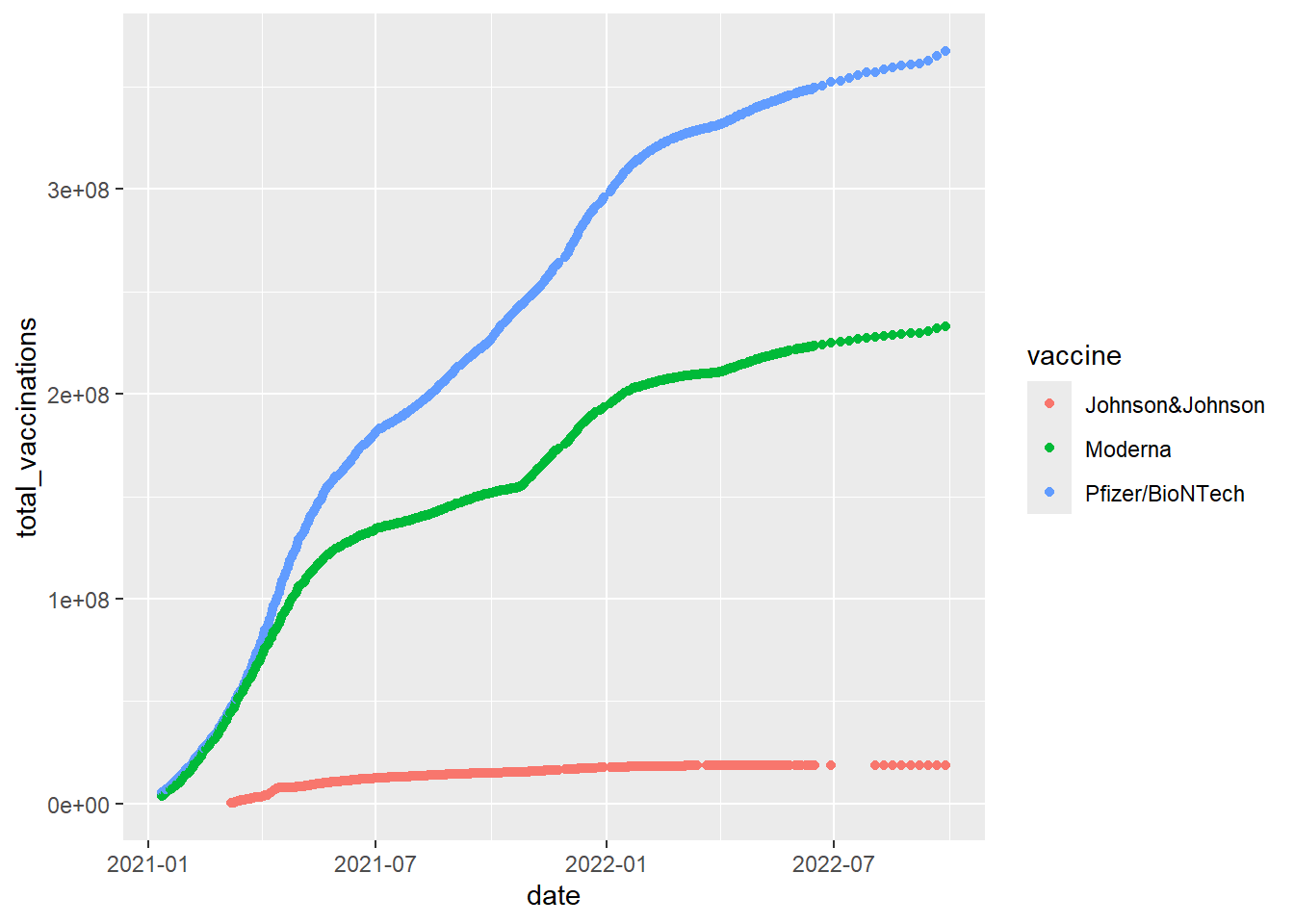 makes scatter plots, which plot two numeric (or Date) variables. A third categorical variable is often brought in for color. For example, we can compare different vaccine types used in the US by
