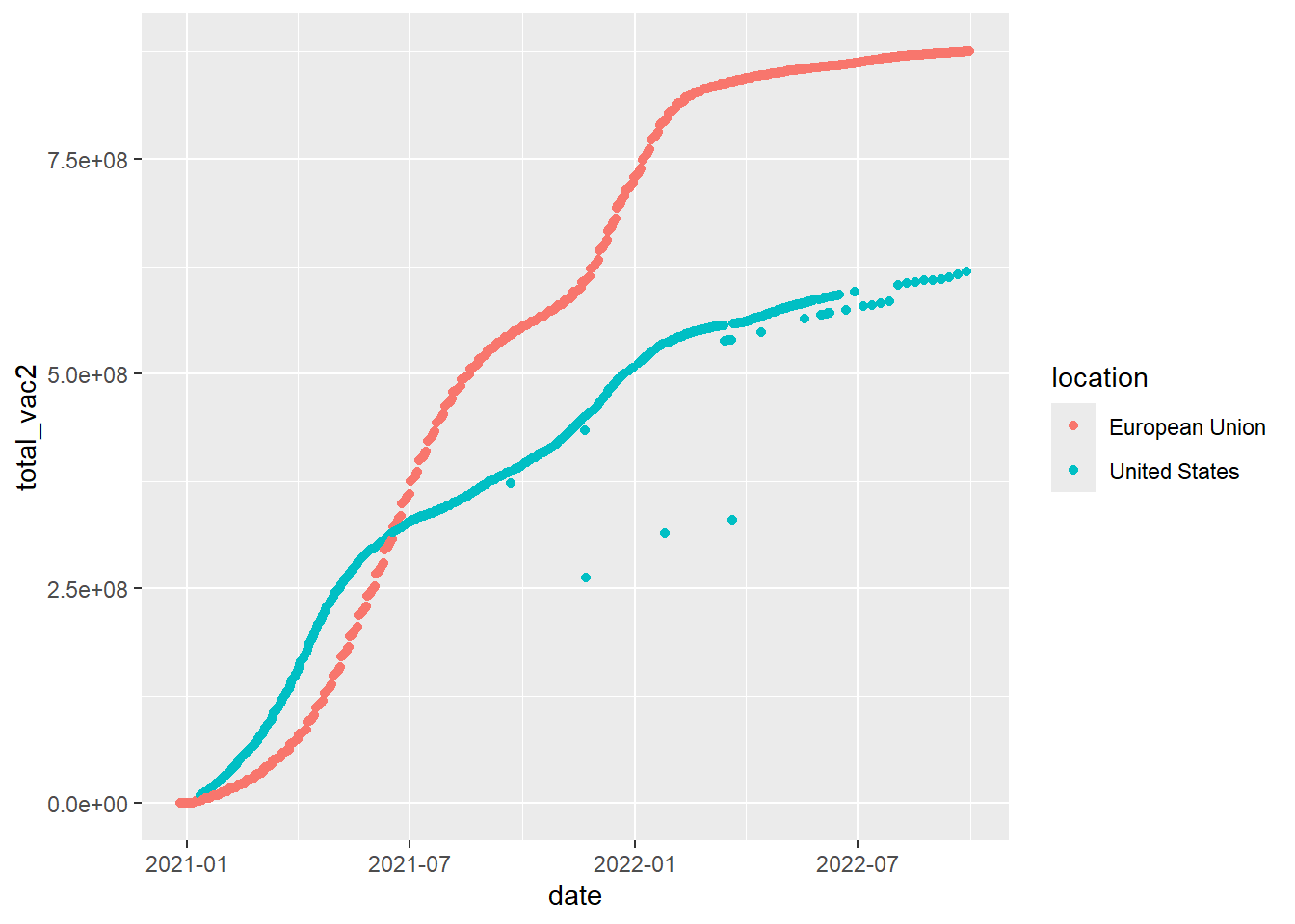 d1 filter(location %in% c('United States', 'European Union')) %>%