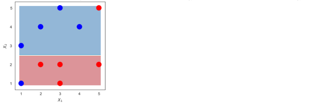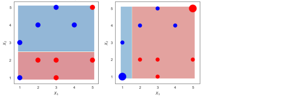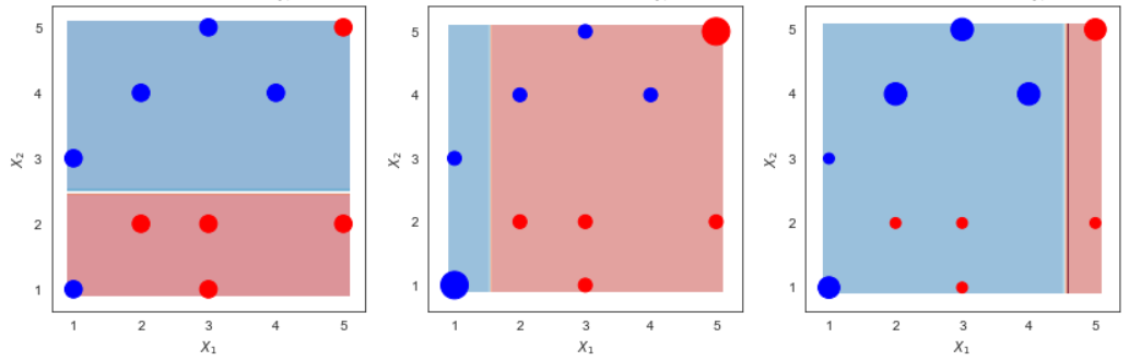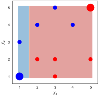 --- <style> .remark-slide-content { background-color: #FFFFFF; border-top: 80px solid #F9C389; font-size: 20px; font-weight: 300; line-height: 1.5; padding: 1em 2em 1em 2em } .inverse { background-color: #696767; border-top: 80px solid #696767; text-shadow: none; background-image: url(https://github.com/goodekat/presentations/blob/master/2019-isugg-gganimate-spooky/figures/spider.png?raw=true); background-position: 50% 75%; background-size: 150px; } .your-turn{ background-color: #8C7E95; border-top: 80px solid #F9C389; text-shadow: none; background-image: url(https://github.com/goodekat/presentations/blob/master/2019-isugg-gganimate-spooky/figures/spider.png?raw=true); background-position: 95% 90%; background-size: 75px; } .title-slide { background-color: #F9C389; border-top: 80px solid #F9C389; background-image: none; } .title-slide > h1 { color: #111111; font-size: 40px; text-shadow: none; font-weight: 400; text-align: left; margin-left: 15px; padding-top: 80px; } .title-slide > h2 { margin-top: -25px; padding-bottom: -20px; color: #111111; text-shadow: none; font-weight: 300; font-size: 35px; text-align: left; margin-left: 15px; } .title-slide > h3 { color: #111111; text-shadow: none; font-weight: 300; font-size: 25px; text-align: left; margin-left: 15px; margin-bottom: -30px; } </style> <style type="text/css"> .left-code { color: #777; width: 40%; height: 92%; float: left; } .right-plot { width: 59%; float: right; padding-left: 1%; } </style> # Adaboost  --- # Adaboost  --- # Adaboost, Clearly Explained - Demonstration by StatQuest - [Link](https://www.youtube.com/watch?v=LsK-xG1cLYA) --- # Calculation Example Data .pull-left[ | `\(x_1\)` | `\(x_2\)` | y | |----|----|----| | 1 | 1 | 1 | | 1 | 3 | 1 | | 2 | 2 | -1 | | 2 | 4 | 1 | | 3 | 1 | -1 | | 3 | 2 | -1 | | 3 | 5 | 1 | | 4 | 4 | 1 | | 5 | 2 | -1 | | 5 | 5 | -1 | ] .pull-right[ ] --- # Calculation Example Data .pull-left[ | `\(x_1\)` | `\(x_2\)` | y | |----|----|----| | 1 | 1 | 1 | | 1 | 3 | 1 | | 2 | 2 | -1 | | 2 | 4 | 1 | | 3 | 1 | -1 | | 3 | 2 | -1 | | 3 | 5 | 1 | | 4 | 4 | 1 | | 5 | 2 | -1 | | 5 | 5 | -1 | ] .pull-right[ <!-- --> ] --- # Adaboost in a nutshell --- # Make Stump 1 <!-- --> --- # Make Stump 2 <!-- --> --- # Make Stump 3 <!-- --> --- # Combine the Stumps <!-- --> --- class: inverse, center, middle # Detail Calculation --- # Make the first stump .pull-left[ ] .pull-right[ |Row | x1 | x2 | y | |----|------|------|-----| | 0 | 1 | 1 | 1 | | 1 | 1 | 3 | 1 | | 2 | 2 | 2 | -1 | | 3 | 2 | 4 | 1 | | 4 | 3 | 1 | -1 | | 5 | 3 | 2 | -1 | | 6 | 3 | 5 | 1 | | 7 | 4 | 4 | 1 | | 8 | 5 | 2 | -1 | | 9 | 5 | 5 | -1 | ] --- # Make the first stump .pull-left[ - Assign weights for each row - Every row has the same weight in the first step ] .pull-right[ |Row | x1 | x2 | y | |----|------|------|-----| | 0 | 1 | 1 | 1 | | 1 | 1 | 3 | 1 | | 2 | 2 | 2 | -1 | | 3 | 2 | 4 | 1 | | 4 | 3 | 1 | -1 | | 5 | 3 | 2 | -1 | | 6 | 3 | 5 | 1 | | 7 | 4 | 4 | 1 | | 8 | 5 | 2 | -1 | | 9 | 5 | 5 | -1 | ] --- # Make the first stump .pull-left[ - Assign weights for each row - Every row has the same weight in the first step ] .pull-right[ |Row | x1 | x2 | y | Weight 1 | |----|------|------|-----|------------| | 0 | 1 | 1 | 1 | 0.1 | | 1 | 1 | 3 | 1 | 0.1 | | 2 | 2 | 2 | -1 | 0.1 | | 3 | 2 | 4 | 1 | 0.1 | | 4 | 3 | 1 | -1 | 0.1 | | 5 | 3 | 2 | -1 | 0.1 | | 6 | 3 | 5 | 1 | 0.1 | | 7 | 4 | 4 | 1 | 0.1 | | 8 | 5 | 2 | -1 | 0.1 | | 9 | 5 | 5 | -1 | 0.1 | ] --- # Make the first stump .pull-left[ - Use Weighted Gini-Index to calculate the children entropy of all candidate splits ] .pull-right[ |Row | x1 | x2 | y | Weight 1 | |----|------|------|-----|------------| | 0 | 1 | 1 | 1 | 0.1 | | 1 | 1 | 3 | 1 | 0.1 | | 2 | 2 | 2 | -1 | 0.1 | | 3 | 2 | 4 | 1 | 0.1 | | 4 | 3 | 1 | -1 | 0.1 | | 5 | 3 | 2 | -1 | 0.1 | | 6 | 3 | 5 | 1 | 0.1 | | 7 | 4 | 4 | 1 | 0.1 | | 8 | 5 | 2 | -1 | 0.1 | | 9 | 5 | 5 | -1 | 0.1 | ] --- # Make the first stump .pull-left[ - Use Weighted Gini-Index to calculate the children entropy of all candidate splits - The split with the lowest children impurity is the best split ] .pull-right[ |Row | x1 | x2 | y | Weight 1 | |----|------|------|-----|------------| | 0 | 1 | 1 | 1 | 0.1 | | 1 | 1 | 3 | 1 | 0.1 | | 2 | 2 | 2 | -1 | 0.1 | | 3 | 2 | 4 | 1 | 0.1 | | 4 | 3 | 1 | -1 | 0.1 | | 5 | 3 | 2 | -1 | 0.1 | | 6 | 3 | 5 | 1 | 0.1 | | 7 | 4 | 4 | 1 | 0.1 | | 8 | 5 | 2 | -1 | 0.1 | | 9 | 5 | 5 | -1 | 0.1 | ] --- # Make the first stump .pull-left[ - Use Weighted Gini-Index to calculate the children entropy of all candidate splits - The split with the lowest children impurity is the best split - **NOTE**: You are not required to make the stump. So the stump will be given to you! ] .pull-right[ |Row | x1 | x2 | y | Weight 1 | |----|------|------|-----|------------| | 0 | 1 | 1 | 1 | 0.1 | | 1 | 1 | 3 | 1 | 0.1 | | 2 | 2 | 2 | -1 | 0.1 | | 3 | 2 | 4 | 1 | 0.1 | | 4 | 3 | 1 | -1 | 0.1 | | 5 | 3 | 2 | -1 | 0.1 | | 6 | 3 | 5 | 1 | 0.1 | | 7 | 4 | 4 | 1 | 0.1 | | 8 | 5 | 2 | -1 | 0.1 | | 9 | 5 | 5 | -1 | 0.1 | ] --- # Make the first stump .pull-left[ - Use Weighted Gini-Index to calculate the children entropy of all candidate splits - The split with the lowest children impurity is the best split - **NOTE**: You are not required to make the stump. So the stump will be given to you! - Here is the first stump ] .pull-right[ <!-- --> ] --- # Make the first stump .pull-left[ - **Stump 1**: `\(I(x_2>2.5)\)` ] .pull-right[ <!-- --> ] --- # Prediction of Stump 1 .pull-left[ - **Stump 1**: `$$I(x_2>2.5)$$` - If `\(x_2 > 2.5\)`, predicts `\(y=1\)`. - Otherwise, predicts `\(y=-1\)` ] .pull-right[ | Row | x1 | x2 | y | Stump 1 Predicts | |-----|----|----|----|------------------| | 0 | 1 | 1 | 1 | -1 | | 1 | 1 | 3 | 1 | 1 | | 2 | 2 | 2 | -1 | -1 | | 3 | 2 | 4 | 1 | 1 | | 4 | 3 | 1 | -1 | -1 | | 5 | 3 | 2 | -1 | -1 | | 6 | 3 | 5 | 1 | 1 | | 7 | 4 | 4 | 1 | 1 | | 8 | 5 | 2 | -1 | -1 | | 9 | 5 | 5 | -1 | 1 | ] --- # Error of the first stump |Row | x1 | x2 | y | Stump 1 Predicts | 