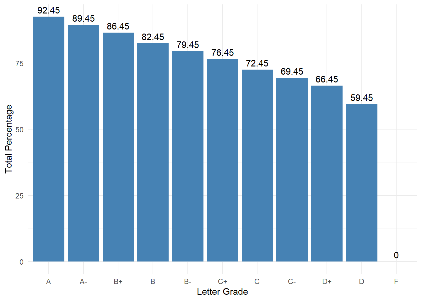 A- | 89.45 - 92.44% | C- | 69.45 - 72.44% |