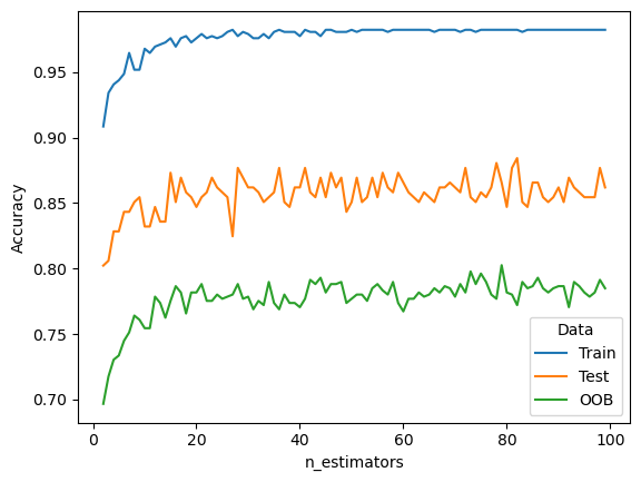 sns.lineplot(data=rs, y="Accuracy", x="n_estimators", hue='Data', ci=None) <Axes: xlabel='n_estimators', ylabel='Accuracy'>